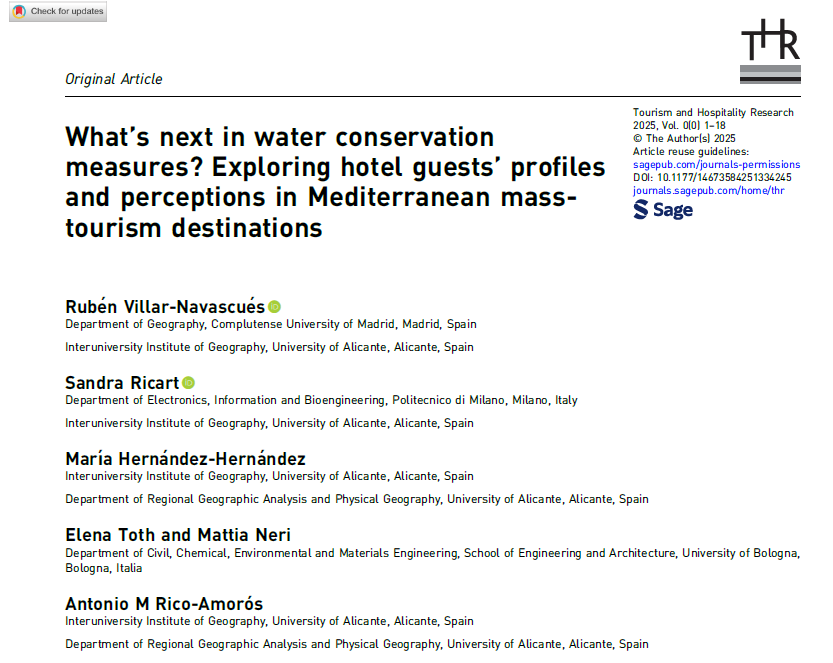 Research paper exploring tourists' perceptions of water-saving measures in the Mediterranean destinations of Benidorm (Spain) and Rimini (Italy) during the summer of 2021 published in Tourism and Hospitality Research (THR)