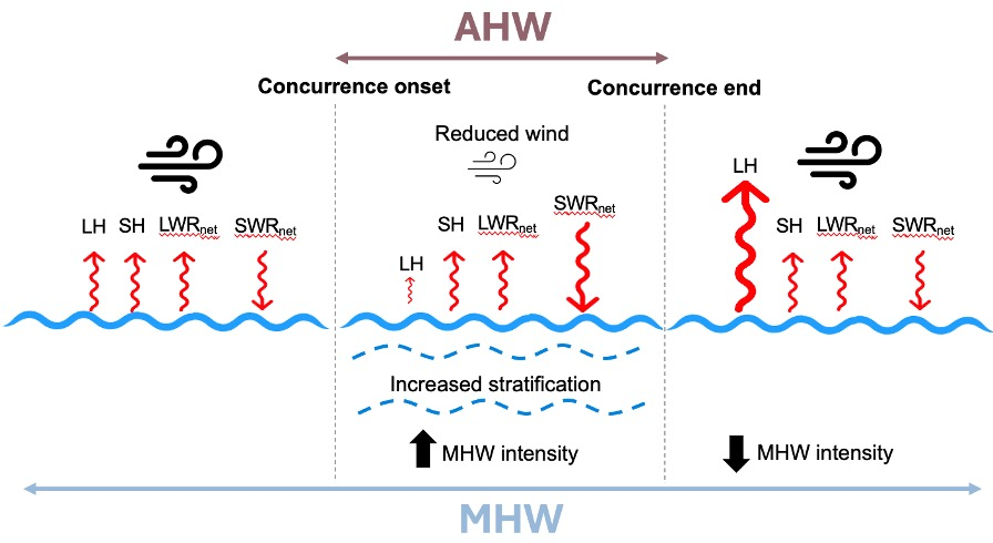 Concurrent atmospheric heatwaves intensify marine heatwaves through air-sea heat flux change in the Mediterranean Sea